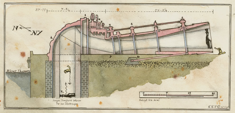 But this did not deter Alexander. Instead, his thoughts turned to the possibility of “travelling” across the ocean without actually moving. What, he imagined, if one could see all the way to New York without having to leave London? He began to sketch out an idea for a “device for the suppression of absence”, a powerful optical machine which, if installed at both ends of the tunnel, would magnify the view through it.